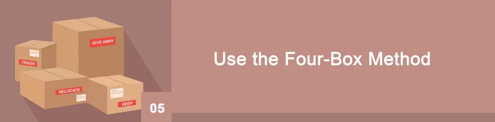 As you set out to declutter a space in your home, adapt the four-box technique suggested by Becker in BecomingMinimalist.com to help you with this process. Prepare four boxes that will be titled trash, give away, keep, and relocate. As you consider and evaluate each item, try to place them into one of these four categories so it will be easier for you to sort things out later on.